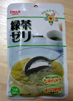新しいレイアウトのシステムを採用したので、更新保守などはかなり容易になりましたが、これを作成するためにかなりの試行錯誤が必要になりました…(汗)。 そんな読む側からすればどうでも良いことはさておき、明治乳業の、介護用向けの食品となりますこの緑茶ゼリー、水分補給と称している割には、1パック100グラムです。…なんか少ないです。私が若者だからですか? ビジュアル的に弱いので、さっそく中身を器に空けてみました。うわっ。インパクト(汗)。